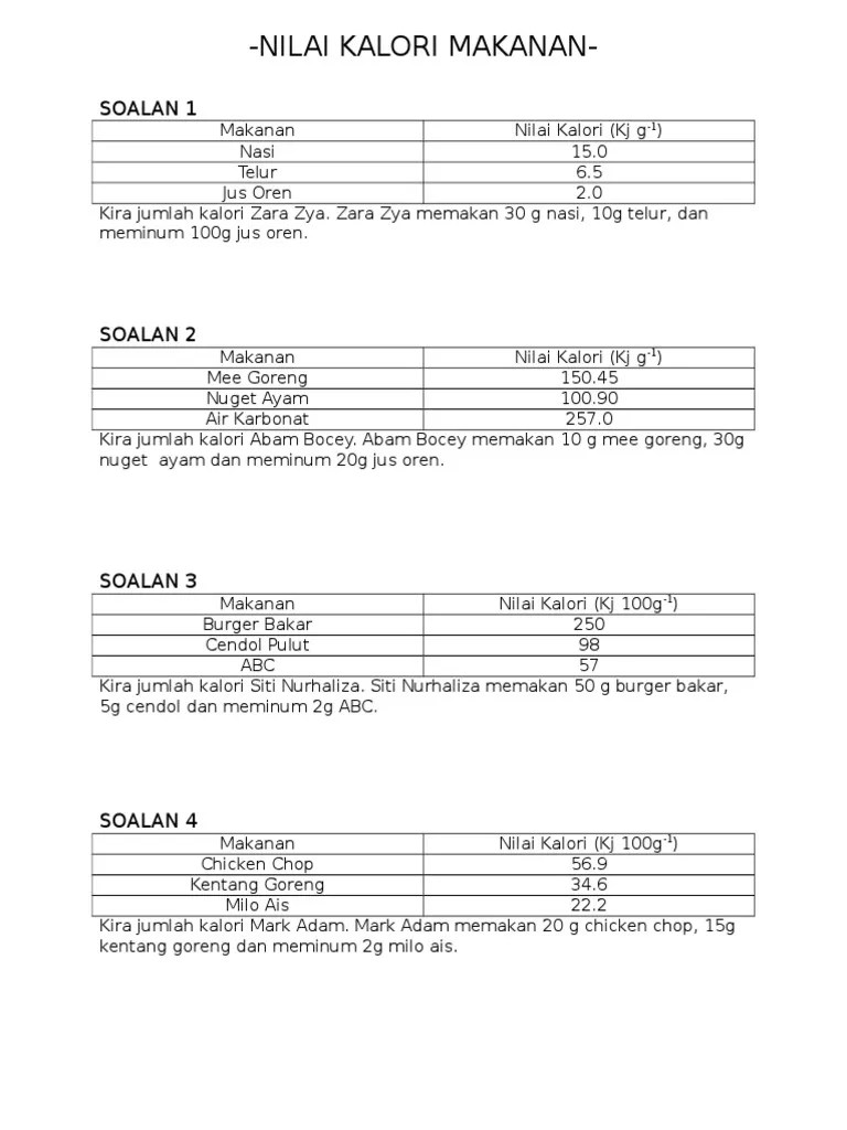 Nutrisi yang baik dan seimbang. Contoh pengiraan kalori bagi 100 gram nasi adalah seperti jadual di bawah . (c) tulis formula pengiraan nilai kalori dalam sampel makanan yang diukur dengan alat dalam soalan 2(b). Konsep tenaga (kalori) • untuk . Free · world war c: Cara mengira nilai kalori makanan sains tingkatan 5. Untuk menentukan nilai tenaga dalam sampel makanan. Nilai kalori bagi sesuatu makanan bergantung kepada tiga kelas makanan utama tersebut.